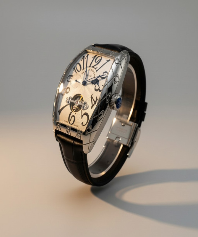 Display: Skeleton dial with visible inner mechanics and rotating tourbillon-style feature at 6 o’clock