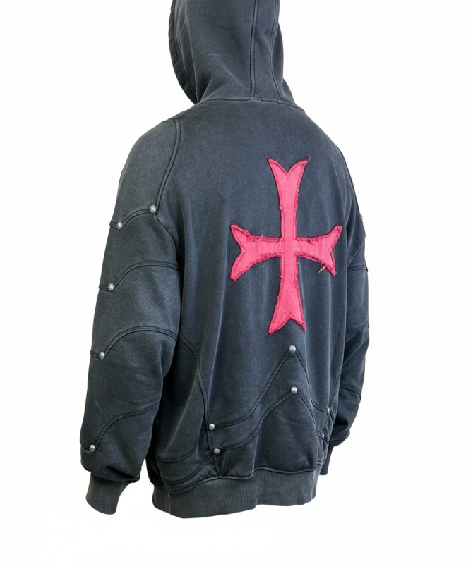 Details: Hand-placed metal rivets, raw-edge Crusader cross patch