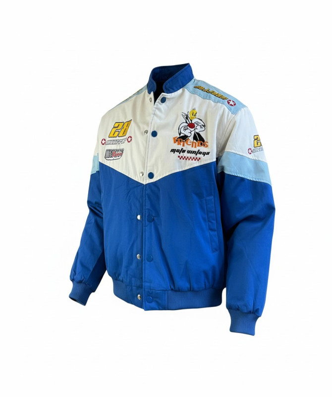 Vintage -style varsity jacket inspired by toy story, featuring bold embroidery, iconic patches and a standout color-block design for a unique streetwear look