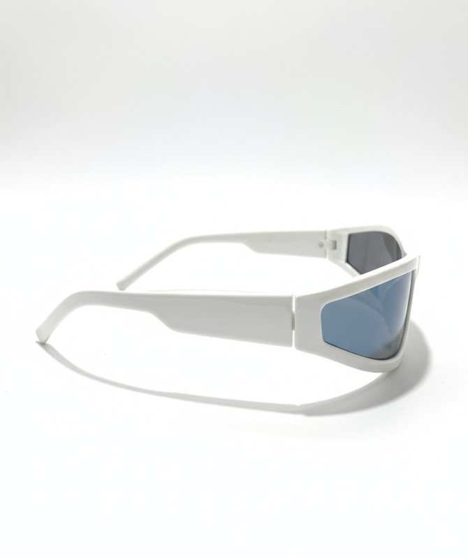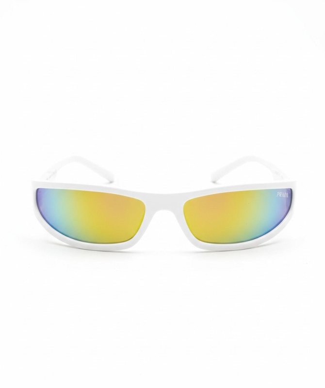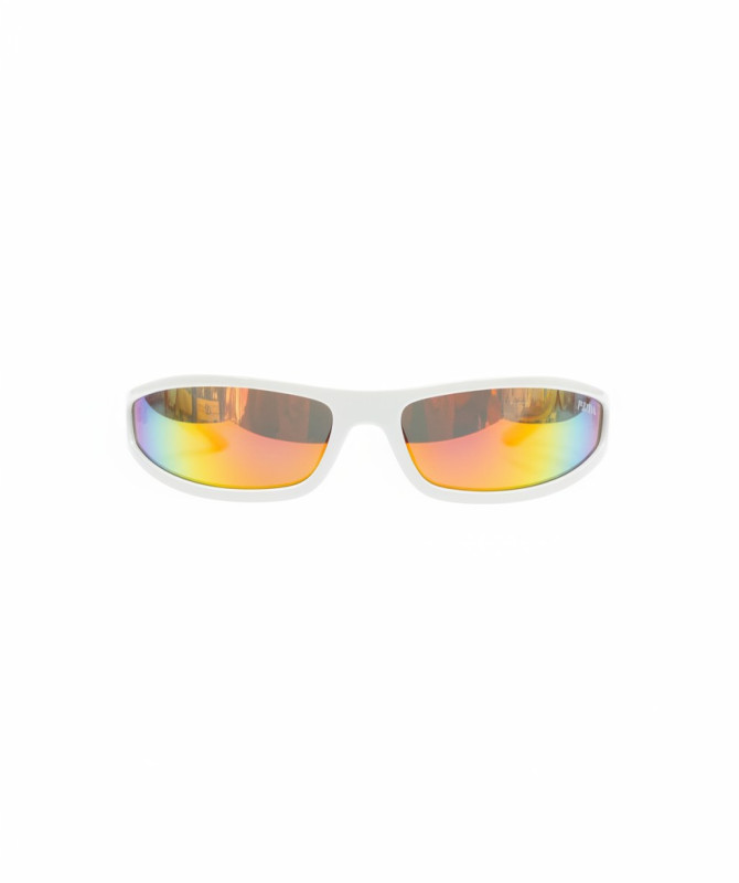 Channel retro-futuristic vibes with these Y2K narrow wraparound sunglasses. Featuring a sleek white frame and vibrant rainbow mirrored lenses, they’re the perfect blend of sporty performance and bold street style.Slim, narrow wraparound frame for a futuristic Y2K look