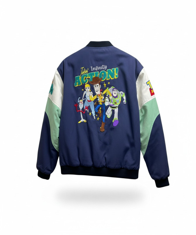Vintage -style varsity jacket inspired by toy story, featuring bold embroidery, iconic patches and a standout color-block design for a unique streetwear look